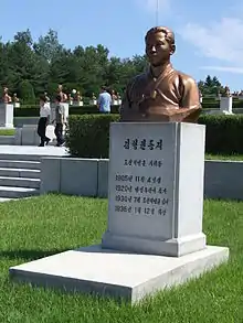 Kimhyonggwon County, previously known as Pungsan, in southeastern Ryanggang Province, was renamed after him in August 1990.[16] There is also a Kim Hyong Gwon Teachers' College named after him, and Hamnam University of Education Nr. 1 was renamed Kim Hyong Gwon University of Education in 1990. Both of them are in Sinpo.[17] Various sites of honor and statues have been made in Kim's memory. Once every five years, a ceremony is held on the days of his death and birth.[3]