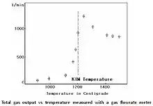 The reformer reforms all carbon atoms of carbonaceous feedstock to produce just syngas, no other hydrocarbons. The high temperature furnace is packed with castables to minimize heat loss in such a way as to maintain the inner temperature of a reduction reactor filled with steam and carbon dioxide (CO2) gas at a temperature just above 1200 °C (aka Kim temperature, see figure 2),[1] and it reforms all carbonaceous substances most efficiently to produce syngas. The produced syngas exits from the reduction reactor at a temperature of 1200 °C. The reduction chamber is heated by super-hot gases (steam and CO2) generated in the syngas burner with oxygen gas. The reduction chamber must be constructed to withstand, physically and chemically, the reforming reaction at 1200 °C.
