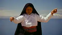 In 1999, Kimsooja presented her most iconic work: A Needle Woman, a performance video piece that premiered at CCA Kitakyushu and further evolved in subsequent showings as a multi-channel video projection.[4] In A Needle Woman, the artist is seen with her back facing the camera, wearing precisely the same clothes and standing precisely the same way in various metropolises:[19] Tokyo, Shanghai, Delhi, New York, Mexico City, Cairo, Lagos, London, Patan, Nepal (1999–2001); and in a second series of performances: Havana, Cuba; N’Djamena, Chad; Rio de Janeiro, Brazil; Sana’a, Yemen; and Jerusalem (2005).[4] Some locations visited in the work are places of violence, disrepair, or unresolved conflict, lending to the needle a metaphoric function as an instrument of healing.[19] Also in A Laundry Woman (2000), a performance video piece shot in India, Kimsooja is seen immobile and standing in front of a river where debris seemingly drift. A Needle Woman and A Laundry Woman exposed the artist's stances on non-doing and immobility as a form of art practice; specifically, lending to the action of immobility the virtue of inverting an audience's linear perception of space and time.[19] The first version of A Needle Woman presented the artist laying horizontally on a rock and it established nature and spatial orientation as a central subject in her work. As well, her use of the Korean color spectrum (Obangsaek), in which each color stands for a cardinal direction in Korean tradition, took up great importance.[20]