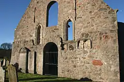 The remains of the former parish church dedicated to St Erchard and the Virgin Mary, which appears from documentary evidence to have been a minster in origin.[20] St Erchard is said to have been a local disciple of St Ternan [21] and to be buried in the church. The ruin, of small stones and run lime was repaired and stripped of ivy etc in 1931 to reveal possible 14th century detail including a fine walled-up north door and lancet windows. The granite belfry probably dates from about 1640. The date of foundation of the church is not known but it passed into the possession of the hospital in its foundation before 1231. Foundations which extend 22 meters east of the east gable and architectural peculiarities of the gable itself suggest that the hospital may have adjoined the church on the east. Two windows in the upper part of the gable look into the church as if from an upper floor of the adjoining building as occurred in some monastic buildings in order that sick persons might hear the service. In this case the lancet windows in the east gable would be later insertions, probably dating from the period when the adjoining building was removed. They may in fact have belonged to that building. The church was in use until 1861 when a new church was built. The roof was removed in 1862 and in 1869 the interior was divided into private burial grounds for the ministers and certain of the heritors. Granted with all its pertinents to the hospital of Kincardine O'Neil by its founder, Alan Durward, before 1231, this grant was confirmed in 1250. Along with this church apparently passed its four pendicles of Glentanar, Lumphanan, Cluny and Midmar. The last two of these may, however, have been granted to the hospital independently and were served by vicars in 1274, the hospital master then being taxed 'pro omnibus eclesiis'. In 1330 the hospital with its annexed chapels was erected with the consent of Duncan, earl of Fife, into a prebend of Aberdeen cathedral by Bishop Alexander de Kyninmund. The residual fruits of this prebend with its four annexed chapels were appropriated in 1501 to the Chapel Royal at Stirling, provision being made for vicar pensioners, but it is doubtful whether this was effective. The prebend itself remained with a canon of Aberdeen cathedral, who possessed the parsonage and vicarage teinds of all four pendicles, but only the parsonage teinds of the mother church, the cure being served by a perpetual vicar. The church measures 20.6m by 8.3m with walls 1.0m to 1.3m thick. The foundations on the east side are clearly visible, just protruding through the turf and denote a building of similar dimensions to the church. The North-East corner of the foundations are destroyed.