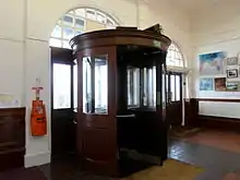 At a size of 136 feet (41 m) long, 60 feet (18 m) wide and 20 feet (6.1 m) high, the Hall provided space for seating 1,500.[6] In 1913 the ceiling was plastered with a cornice and a "deep frieze of a delicate tint, and a picture moulding" around three sides of the Hall; this has now been replaced.[2] The four main reinforced concrete roof beams create five ceiling bays, and in each bay are three plaster centrepieces representing vines and grapes. These are ventilator-covers. The middle one of each three originally carried copper bronze electroliers with chains and Holophane reflectors.[2] (Today, more numerous and bigger lights are fixed there.) The walls were originally largely of glass and painted in eau de nil or pale green, with a darker shade on the dado.[2][3] The special dance floor was rock maple over concrete, and the acoustics were said to be "perfect".[2][3] There was a further tiered seating area on the roof for 1,100 deckchairs facing the cast iron bandstand and linking the roof with the Downs.[3][6] The roof was "illuminated by five electric light standards, and the columns, the upper ornamental part of the bandstand, and the ribs of the bandstand roof [were] picked out with fairylights."[2] The box office in the vestibule was "artistically designed . . . of brick faced with plaster in the Georgian style."[2] The marble plaque on its front was carved by Emil Fuchs who had designed the King Edward VII Coronation Medal.[35] The old tongue-and-groove wood flooring of the vestibule was now replaced with terrazzo paving, with the town crest decorating the area in front of the kiosk (today this is covered over, or possibly removed). Over the Hall's exit doors (now removed) and over the kiosk were bullseye glass circles.[2][3]