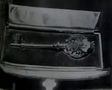 Councillor Farley gave a speech glorifying the Pavilion, the town, and Mr Dence the donor. He said, to applause, that he "hoped all would do their duty in maintaining and preserving it for the purpose for which it had been granted to the town". Mr Ingleton the builder presented a silver-gilt key to Mr Dence. On the front it bore an enamelled plate showing the heron,[32] the clock tower and Reculver. The reverse of the key bore the inscription: "Presented to T. Dence Esq., donor of the East Cliff Pavilion, Herne Bay, by A.S. Ingleton, April 4, 1904."[12] Palmer the architect explained the building's construction (detailed above), then Thomas Dence the donor gave a long and much applauded speech (also detailed above). An unnamed person unveiled the plaque commemorating Dence's gift, and the Clerk to the Council read and presented an address of thanks, engrossed and illuminated on vellum, to Dence. Various councillors followed that with speeches of mutual thanks and compliments, and the band on the roof ended the ceremony with God Save the King. Refreshments were provided in the gentlemen's reading room for the invited 300, who then joined the crowd on the roof to hear a concert by the Royal Engineers Band.[1]
