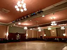 The original 1913 stage incorporated a faux cottage standing on an apron platform against the south wall of the Hall. After Herne Bay's two other theatres were burned down in the 1920s, The King's hall consequently had to take on all the large concerts.[3][36] The little cottage stage was seen to be inadequate, and a large stage with proscenium arch was built at the east end of the room. The faux cottage and apron were eventually dismantled.[36] With the old "cottage" stage against the south wall and the four large concrete ceiling-beams running north-south, the acoustics had been considered perfect. However the positioning of the new stage against the east wall caused some of the soundwaves to be blocked or diverted by the same beams which now crossed their path, so that the audience never again experienced satisfactory acoustics.[3] However the Hall's original maple dance floor was "considered by some to be one of the best in Kent".[36] The original seating of the Hall consisted of several rows of tip-up chairs in green plush, and the remaining chairs were of fumed oak.[2]