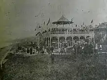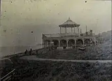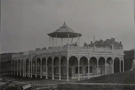 The original building was a bandstand funded in 1903–1904 by Thomas Dence (1840–1918), a local developer who had been involved in the Frome Park Estate in Stroud Green and roads in the parish of St Mary, Islington, and owned property in Herne Bay.[6][8][9][10][11] Dence had moved to Herne Bay for his health, bought the Downs, laid out roads at the top and built himself a house on Beacon Hill close by.[12] He conveyed the remaining sloping land back to the Council, and in 1901 and 1903 suggested plans for a bandstand.[3][4][12] He had in mind: