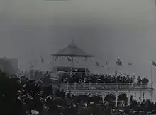The Pavilion was opened at 3pm on Easter Monday, 4 April 1904.[12] Thousands of spectators stood outside, and 300 invited persons squeezed into the little hall (now the vestibule). People pressed their faces against the windows or stood in a "dense mass" on East Cliff, and the door was guarded by Mr Boorman the Town Beadle in "sober uniform". The Pavilion was decorated with streamers, and flags including the Union Jack, the French Tricolour and the US Stars and Stripes. The Band of the Corps of the Royal Engineers was conducted by Lieutenant Summer in the bandstand on the roof. Inside the hall, flags were arranged around the walls and over Dence's memorial tablet awaiting the unveiling ceremony.[12] The platform and its table were piled and surrounded with flowers. The band stopped, the audience stood, and the Council dignitaries processed onto the platform, headed by Chairman of the Council G. Farley JP, CC, with Mrs Dence on his arm, and guest of honour Thomas Dence who drew special applause. Proceedings were begun by a child, thus: