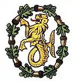 The supporters are based on the crest of the Hunstanton Urban District Council. The lion is a variation of the lions, or leopards, in the Royal Coat of Arms of the United Kingdom and its fish tail suggests the borough's links with the sea.[27] The fish–lion is also the central feature in the borough's badge, but here it is surrounded by a garland of oak leaves as a reference to the rural nature of much of the district. Oak leaves also appear in the coronet in the crest of the former Downham Market Urban District Council.[27]