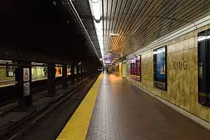 King is a subway station on Line 1 Yonge–University of the Toronto subway system. The station is located at the intersection of King Street and Yonge Street in Toronto's Financial District.[2] Wi-Fi service is available at this station.[3]