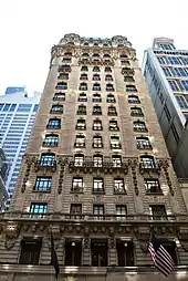 John Jacob Astor died when the RMS Titanic sank in 1912.[14] His 20-year-old son Vincent Astor inherited $150 million of real estate, including the St. Regis Hotel, which had been valued at $2.675 million.[74] That year, amid rumors that Vincent was planning to expand the St. Regis, William Rockefeller bought the house at 12 East 55th Street, immediately east of the hotel.[75] Rockefeller already owned the houses at 3–9 East 54th Street, preventing Vincent from expanding the hotel to the south, and the hotel's other two sides faced the street.[21] Haan announced in May 1921 that he would build an 18-story annex, with 150 rooms, to the east of the existing hotel, although this did not happen.[76][77] Rockefeller's houses on 54th and 55th Streets, which had long prevented the hotel's expansion, were sold in 1924.[78]