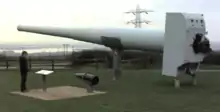 The class was designed to carry twelve 14-inch guns in three quadruple turrets and this configuration had a heavier broadside than the nine 15-inch guns. It proved impossible to include this amount of firepower and the desired level of protection on a 35,000 ton displacement and the weight of the superimposed quadruple turret made the stability of the vessel questionable.[76] The second forward turret was changed to a smaller two-gun turret in exchange for better armour protection, reducing the broadside weight to below that of the nine gun arrangement.[76] The 14-inch Armour Piercing (AP) shell also carried a very large bursting charge of 48.5 lb (22.0 kg).[77][78][79] The armour-piercing capability of the gun and its ammunition is exhibited by the conning tower on the wreck of the German battleship Bismarck, provided with 14-inch thick armour, which is said to resemble a "Swiss cheese".[80] The last naval treaty had an escalator clause that permitted a change to 16-inch guns if another signatory did not conform to it by 1 January 1937. Although they could have invoked this clause, the effect would have been to delay construction and it was considered prudent to build with 14-inch rather than find themselves without the new battleships. The U.S. opted to absorb a delay and built its ships with larger guns.[81] When comparing the British 14-inch gun to the heavier guns mounted on contemporary foreign battleships, the thicker armour of the British battleships tended to result in an equalisation of the relative penetrating power of respective shells.[82]