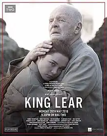 King Lear is a 2018 British-American television film directed by Richard Eyre. An adaptation of the play of the same name by William Shakespeare, cut to just 115 minutes, it was broadcast on BBC Two on 28 May 2018.[1] Starring Anthony Hopkins as the title character, the adaptation is set in a highly militarised version of 21st-century London and depicts the tragedy that follows when the sovereign King Lear announces the end of his reign and the division of his kingdom among his three daughters. The adaptation was met with positive reviews, which commended its acting, and many singled out Hopkins for his performance in the title role.