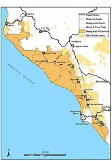 The King Range Wilderness is a 42,585-acre (172 km2) federally designated wilderness area within the King Range National Conservation Area in northern California, United States. The area was set aside with the passage of the Northern California Coastal Wild Heritage Wilderness Act of 2006 (Public Law 109-362). The Bureau of Land Management is the responsible agency and is currently working on a Management Plan for the King Range Wilderness.[1] This section of California's coastline is known as the "Lost Coast", a landscape too rugged for highway building, which forced the construction of State Highway 1 and U.S. 101 inland.[2] The King Range Wilderness is the longest undeveloped coast, outside of Alaska, in the United States.[3]