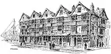 - Number 16 is a historic house, which now serves as an office. It dates from around 1665 and was designated a Grade II* listed building by English Heritage on 8 January 1959. The house is a timber-framed four storey building with a basement, and features an 18th-century timber parapet in front of the gable on the roof. The ground floor front dates to the 19th century. The inner staircase, to the right of the centre features "turned balusters and square newels with ball finials and roll-topped rail, door frames with ovolo mouldings and cyma stops".[8]
