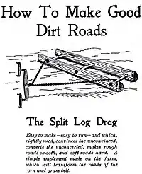 The widespread use of the King Road Drag came along during the Good Roads Movement, driven by bicyclists and later by automobile drivers. Automobiles benefitted since Macadam roads were rapidly destabilized by cars, which sucked the cementing dust out of smooth macadam roads.[6] Solid roads meant people could use their automobiles on the roads between cities. Solid rural roads also made possible reliable rural mail delivery, which did much to promote commerce in the United States between city based businesses and the rural population. For instance, they allowed Sears, Roebuck to start sending out its catalogues to small towns and farms and thereby vastly increase the size of its customer base.[7]