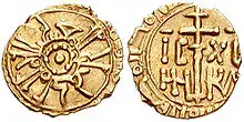 At Mahdia, Roger I and William I minted dinars of pure gold, 22 mm in diameter and weighing 4.15 g with Cufic inscriptions, probably for internal circulation in Africa.[33] The only two known coins were first discovered by the Tunisian scholar H. H. Abdul-Wahab in 1930. They were a close imitation of a type minted by the Fatimid caliph al-Zahir (1020–35) over a century earlier.[34][33] In Fatimid fashion, the coins have inscriptions in two concentric circles with two lines of text in the centre. The circular text is the same on both sides, while the central text differs. In Roger's coin, it reads "Struck by order of the sublime king (al-malik al-muʿaẓẓam) Roger, the powerful through God [Allah], in the city of Mahdia, in the year 543 [of the Hijrah]", that is, 1148/49, in the outer circle and "Praise be to God, it is fitting to praise him and, indeed, He is deserving and worthy [of praise]" in the inner circle. The obverse centre reads "The King Roger", while the reverse centre contains his laqab "The powerful through God" (al-muʿtazz bi-ʾllāh).[33][35] William's coin is similar, but is dated to is dated to 549 (1154/5) and replaces Roger's Arabic laqab with his own, al-Hādī bi-Amr Allāh ("the Guide according to the command of God").[35] It has been observed that the inscriptions bear a resemblance to those of Robert Guiscard's tarì struck at Palermo in 1072. In both cases the mint would have been staffed entirely by Muslims.[33]