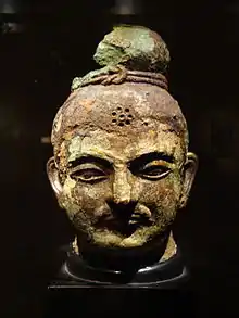 There are four versions of the legend of the founding of Khotan.[15] These may be found in accounts given by the Chinese pilgrim Xuanzang and in Tibetan translations of Khotanese documents. All four versions suggest that the city was founded around the third century BC by a group of Indians during the reign of Ashoka.[5][15] According to one version, the nobles of a tribe in ancient Taxila, who traced their ancestry to the deity Vaiśravaṇa, were said to have blinded Kunãla, a son of Ashoka. In punishment they were banished by the Mauryan emperor to the north of the Himalayas, where they settled in Khotan and elected one of their members as king. However war then ensued with another group from China whose leader then took over as king, and the two colonies merged.[5] In a different version, it was Kunãla himself who was exiled and founded Khotan.[16]