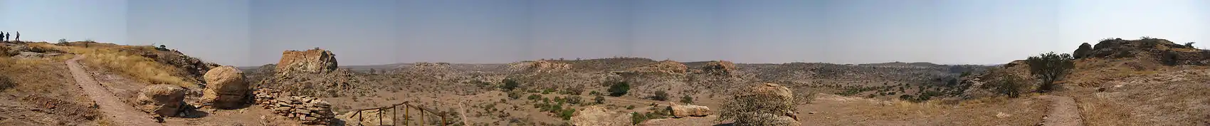 The largest settlement from what has been dubbed the Leopard's Kopje culture is known as the K2 culture and was the immediate predecessor to the settlement of Mapungubwe.[4] The people of the K2 culture, probably derived from the ancestors of the Shona and Kalanga people of southern Africa,[5] was attracted to the Shashi-Limpopo area, likely because it provided mixed agricultural possibilities.[6] The area was also prime elephant country, providing access to valuable ivory. The control of the gold and ivory trade greatly increased the political power of the K2 culture.[7] By 1075, the population of K2 had outgrown the area and relocated to Mapungubwe Hill.[8]