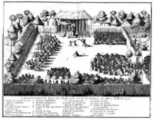 The Whydah army in the 18th century was commanded by the governors of the 26 districts.[8] The governors were expected to arm their men with weapons.[8][9] Assou; Provincial governor and caboceer of the French fort at Whydah, could bring on to field 5–600 men as well as 4 French cannons. Another governor commanded 2,000 men whiles others could field 100, 200 or more men. Specialists existed in the army such as the Captain of the King's Musketeers. The Whydah army was divided into the left and right wings as well as the center which were further divided into platoons. In war, the first to go into action were the Musketeers who fought in the front ranks of the army. The archers followed suit and the army charged in after. The action culminated into hand to hand combat with swords, axes, and knives. Musketeers were employed around the late 17th century but they did not replace the spearmen, swordsmen and archers.[8]