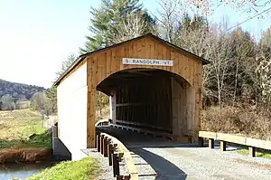 The bridge was built in 1904 by an unknown builder. It is the youngest of the state's historic covered bridges; after this bridge was built, no new covered bridges were built in the state until the 1960s.[3] It was restored in 1980, but closed shortly thereafter due to ice damage. It was repaired again in 1994.[4] The repairs were short-lived as another restoration was completed in 2009.[5]