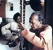 Shankar viewed the Los Angeles centre as a base from which he could also educate the American public about Indian music.[17] When opening the school there, he emphasised the need to recognise the sacred aspect of Indian classical music,[18] which was defined by Allauddin Khan's phrase "Nada Brahma" ("Sound is God").[19] He subsequently became disappointed with the impatience and lack of focus displayed by the majority of his Western students.[20] He said that in many cases, as with his concert audiences in the United States,[21] their motives were based on the misconception that Indian music was allied with the hippie movement's espousal of hallucinogenic drugs and free love.[20][22] Shankar identified Colin Walcott as an exception, calling him "really serious" and "my first American disciple".[20] He also said of Harrison, despite the Beatle eventually relinquishing the sitar:[23] "[Indian music] was not a fad for him, he loved it until the end and became very very dear to me."[24]