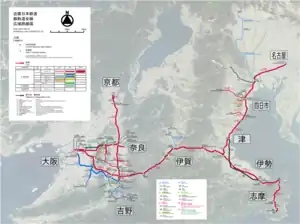 Kintetsu Railway Co., Ltd. (近畿日本鉄道株式会社, Kinki-nippon Tetsudō Kabushiki-gaisha), referred to as Kintetsu (近鉄), is a Japanese passenger railway company, managing infrastructure and operating passenger train service. Its railway system is the largest in Japan, excluding Japan Railways Group.[1] The railway network connects Osaka, Nara, Kyoto, Nagoya, Tsu, Ise, and Yoshino. Kintetsu Railway Co., Ltd. is a wholly owned subsidiary of Kintetsu Group Holdings Co., Ltd.