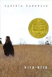 Kira-Kira is a young adult novel by Cynthia Kadohata. It received the Newbery Medal for children's literature in 2005. The book's plot is about a Japanese-American family living in Georgia. The main character and narrator of the story is a girl named Katie Takeshima, the middle child in a Japanese-American family. "Kira-Kira" (キラ キラ in katakana) means glittering or shining.