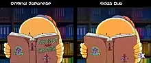 Some of the signs and writings, even those originally in English, were removed. The design of the armored car that King Dedede rode in episodes 1 to 34 had a military camouflage color scheme in Japan, but the American version has an orange and yellow color scheme. Art works resembling Mona Lisa, Venus de Milo etc. in episode 77 have been changed so that it is difficult to associate them with them. A lot of dialogue has been changed, for example in episode 29, Monsieur Goan now speaks normally, and the equivalents of intense spiciness have been changed to "volcano," "pepperoni," "Mexico," etc. The sounds of non-verbal animals, such as the sheep on the village mayor's ranch, as in Pokémon, have also been dubbed. The sheep in the Japanese version make a "meh" sound, while in the American version they make a "baa" sound. Makiko Ohmoto's performance of Kirby is the only voice that was preserved in almost the entirety of the English dub, much like Ikue Ōtani's voicework as Pikachu.