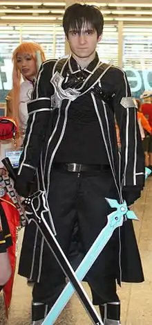 The character has received positive critical reception, and his popularity has led to him being featured in several promotional efforts and merchandise of the series. Kirito makes an appearance in an April 2015 campaign which promotes Namco gaming arcades.[20] Fan-made replicas of Asuna's "Lambent Light" and Kirito's "Elucidator" rapiers have been built by the Man At Arms team of blacksmiths and craftsmen.[21] There are also Kirito, Asuna, and Sinon Sword Art Online-branded perfumes for sale; "Kirito" is described as "dry citrus with a touch of brandy, meant to evoke a mature spirit. It uses green apple, apricot and lime above Muguet, Rose, Jasmine, grapefruit and a musk and brandy base."[22] Sword Art Online glasses based on the characters had a "Kirito" model; "these matte black frames feature a cross and the excalibur on each arm [of the glasses]."[23] A series of anime-inspired Christmas cards featured characters such as Rin Matsuoka from Free!, Godoka from Puella Magi Madoka Magica, and Kirito.[24] He has also appeared in several Sword Art Online-related video games. This includes Dengeki Bunko: Fighting Climax, in which several characters appearing under the Dengeki Bunko imprint are featured.[25] In a costume swap between video games Sword Art Online: Lost Song and God Eater 2: Rage Burst, Lost Song received a Julius costume for Kirito and an Alisa costume for Asuna whilst Rage Burst received costumes of Kirito and Sinon.[26] Asuna, Kirito and Leafa appeared in a campaign by the "Manga Anime Guardians" project in combating anime and manga piracy, with the project being supported by 15 anime production studios and manga publishers.[27]