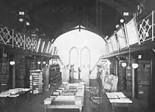 Internally, the chapel has a nave and aisles with the arcade supported on slender iron columns.[50] The roof is of open timber in black walnut and stained pine.[50] Similarly, the former library that is presently part of the expanded chapel (as of 1916) was "finished with open-timbered roof in the native wood."[50] Both the iron columns and the walls were painted in delicate tints.[50] The chapel was described by alumnus Michael C. Barr and architecture professor Edward Wilkens as having "a particularly graceful interior of wood" with "light, delicate proportions."[29]