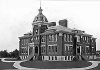 While public education existed in Kirksville from at least the American Civil War era, there was no separate high school building until 1894. The first purpose-built high school building was not built until 1899.[2] However rapid community growth soon necessitated the construction of a bigger KHS in 1914. This building, near downtown Kirksville, served the community well for over forty years. Post-World War II growth and influx of new citizens as well as the post-war baby boom, pointed out the need to plan for the future. As a result, in 1960 the current Kirksville High School was constructed.[3] Its campus-style design was more conducive to expansions and remodeling, both of which have occurred through the decades, ensuring high school education without the high expense of yet another new building. The old Kirksville high school building, constructed in 1914 and located in the 400 block of East McPherson street, fell into disrepair after its discontinued use in the 1980s. Despite efforts to save it, the building was condemned in 2007 and razed in April 2019.