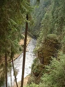 The Kirnitzsch, also called the Kirnscht or Kirnsch in the local dialect, rises in the Lusatian Highlands in Bohemia west of the village of Studánka (German Schönborn) and flows westwards through the town of Krásná Lípa (Schönlinde). Behind the village of Kyjov (Khaa, part of Krásná Lípa) it wends its way along narrow ravines through the sandstone rocks of Bohemian Switzerland. The wild, romantic valley is also called the Khaatal (Kyjovske údoli) (Khaa valley).