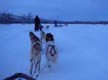 In winter, the Icehotel in nearby Jukkasjärvi and the northern lights attract tourists. The long and certain snow cover, which generally lasts from October to May, and frozen lakes and rivers facilitate cross-country and alpine skiing, dog sledding and snowmobiling. There is ice climbing in the mountains and ice skating on lakes or rivers. The annual Snow Festival is held over the last weekend of January[55] and includes scooter jumping, reindeer racing and an ice sculpture contest.[17][56][57]