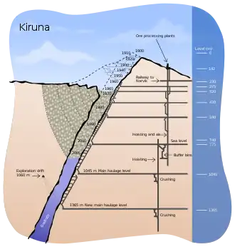 The Kiruna mine is the largest and most modern underground iron ore mine in the world.[1] The mine is located in Kiruna in Norrbotten County, Lapland, Sweden.[1] The mine is owned by Luossavaara-Kiirunavaara AB (LKAB), a large Swedish mining company. In 2018 the mine produced 26.9 million tonnes of iron ore.[2] The Kiruna mine has an ore body which is 4 km (2.5 mi) long, 80 metres (260 ft) to 120 metres (390 ft) thick and reaching a depth of up to 2 km (1.2 mi). Since mining began at the site in 1898, the mine has produced over 950 million tonnes of ore.[1] As of 2020 the main haulage level is 1365 m below the ore outcrop at Kiirunavaara that existed prior to mining.[3]
