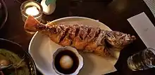 The fried fish has been singled out by reviewers as the restaurant's signature dish.[5][6] It consists of a whole fish or large cut like fish collar, scored in a diamond pattern, battered in potato or rice flour and flash fried. It is served with grated-daikon soy sauce for dipping.[24][27] Gill noted the rarity of seeing whole fish served in Vancouver, and lauded the kitchen for having the confidence to present the dish that way.[20][24]