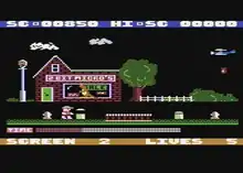 The object of Kissin' Kousins is to guide a little boy from left to right through ten dangerous screens while avoiding many obstacles, both stationary and moving. On reaching the right edge, the background scrolls to the next screen. Obstacles are related to the background: in the city (the first few screens), the player must avoid brick walls, hydrants, and garbage cans. As the player delves deeper into the forest, the obstacles turn into bugs, worms and toadstools. The player also has a pistol, which can be used to shoot at short distances. To increase the difficulty level, a bomb-dropping plane flies overhead, and each screen must be completed in a strict time limit.