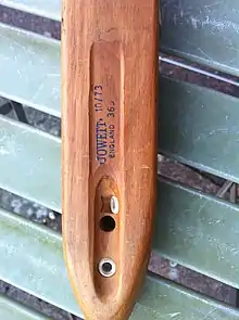 Shuttles were constructed from a dense heavy hardwood with metal tips. The wood was traditionally sourced from a box tree. Imported timbers such as persimmon and cornel were also commonly used. The shuttle was shaped and hollowed using conventional wood working techniques, and the metal tips are pressed onto the block. Strips of fox fur or similar were stuck to the inside of a shuttle to stop the thread ballooning as it left the pirn. There are many designs of shuttle. The Pemberton Loom needed a shuttle with a hinged shuttle-peg to hold the pirn; the later Draper loom shuttles clasped metal rings on the head of the pirn using a spring steel clip. The Draper Company claimed it had developed over 5000 different types of shuttle to meet "the needs of the mills and the whims of the weavers".[5][6]
