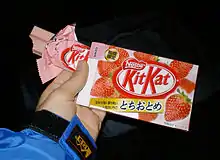 There have been more than 300 limited-edition seasonal and regional flavors of Kit Kat chocolate bars produced in Japan since 2000, many exclusive to the country and not produced elsewhere.[1][2] Nestlé, which operates the Kit Kat brand in Japan, reports that the brand overtook Meiji Chocolate as the top-selling confectionery in Japan from 2012 to 2014.[3] The company's marketing campaign, which partnered with Japan Post to sell the bar in 20,000 post offices, won an award in 2010.[4] The campaign encouraged associations of the product's name with the coincidental cognate Kitto Katsu (きっと勝つ), translated as "You will surely win",[5] and could be mailed as a good luck charm for students ahead of university exams.[2]
