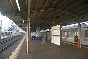 The station has one island platform serving five tracks, with the platform connected to the station building by a footbridge. Track 1 is for non-stop trains, Tracks 2 and 5 are on passing loops, with tracks 3 and 4 served by the platform.