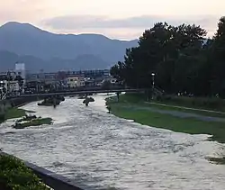 The Kitakami River (北上川, Kitakami-gawa) is the fourth largest river in Japan and the largest in the Tōhoku region. It is 249 kilometres (155 mi) long and drains an area of 10,150 square kilometres (3,920 sq mi).[1] It flows through mostly rural areas of Iwate and Miyagi Prefectures. The source of the river is the Mount Nanashiruge in northern Iwate, from which it flows to the south between the Kitakami Mountains and the Ōu Mountains.[1] The river is unusual in that it has two mouths, one flowing south into Ishinomaki Bay and the other flowing east into the Pacific Ocean, both in Ishinomaki City.