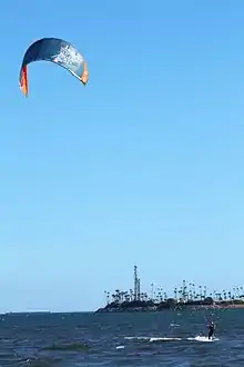 The kite, while 1–2 orders of magnitude larger, bears similarities to the arc kites used in kitesurfing. However, the kite is an inflatable rather than a ram-air kite. Additionally, a control pod is used rather than direct tension on multiple kite control lines; only one line runs the full distance from kite to ship, with the bridle lines running from kite to control pod. Power to the pod is provided by cables embedded in the line; the same line also carries commands to the control pod from the ship.[3]