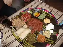 Kitfo cooked lightly rare is known as kitfo leb leb.[1] Kitfo is often served alongside—sometimes mixed with—a mild cheese called ayibe or cooked greens known as gomen. In many parts of Ethiopia, kitfo is served with injera, a spongy, absorbent sourdough crepe-style bread made from fermented teff flour, although in traditional Gurage cuisine, one would use kocho, a thick flatbread made from the ensete plant. An ensete leaf may be used as a garnish. Though not considered a delicacy, kitfo is generally held in high regard.