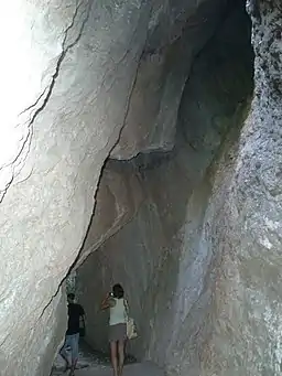 Kizil-Koba (The Krasnaya Cave -literally translates as the Red Cave) is the biggest grotto of the Crimea and one of the karst cave that appear on the limestone in Eastern Europe. The cave is known as the "Kiikin-Kobasy" (Savage's Cave) by local Tatars or “Kiik-Koba” (Wild Cave) chosen by the archeologist Bonch-Osmolowski.[10][6][11]