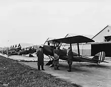 The air wing carried out trial scheduled flights to Hamar and Fredrikstad during the summer of 1920, using the two-seat BE-2s. Eighty-four trips were flown, carrying thirty-five passengers and with five accidents.[26] The air wings main exercise took place in July and August every year. It received Bristol F.2B Fighters in 1921, Hannover Cl.V in 1924[27] and Fokker C.V in 1928.[28] The barracks was expanded in 1926 and again in 1930.[29] Funding for a garrison at Kjeller was secured from 1933, allowing a permanent staff and the establishment of a full-time workshop.[30]