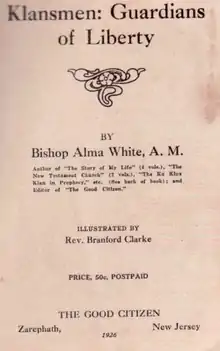 Klansmen: Guardians of Liberty was a book published by the Pillar of Fire Church in 1926 by Bishop Alma Bridwell White and illustrated by Branford Clarke.[1] She claims that the Founding Fathers of the United States were members of the Ku Klux Klan, and that Paul Revere made his legendary ride in Klan hood and robes.[2] She said: "Jews are everywhere a separate and distinct people, living apart from the great Gentile masses ... they are not home builders or tillers of the soil."[3][4] Her book, which contains many anti-Catholic themes, became popular during the United States presidential election of 1928 when Al Smith was the first Catholic presidential candidate from a major party.[5]