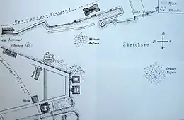 Furthermore, about 3,000 piles, anchoring and other timbers, hearths made of clay and parts of looms, were ensured. The houses were built on platforms, not in the lake, but at the ground level or elevated near the lake shore, which was probably repeatedly exposed to flooding.[3][5] The lake and the Limmat probably also served as transportation way and as source of food. Agriculture, hunting and gathering economy also was verified. Thanks to the excellent preservation conditions in the wet environment, for the time between 4350 BC and 2400 BC, the scientist got further knowledge of the life and economy at that settlement, where the consolidation of the livestock fell in this period of time. The diet of the residents was surprisingly rich: wheat, barley, peas, poppy, wild apples, blackberries, raspberries, strawberries, hazelnuts and whitefish, perch, pike and catfish from the lake. Also found were bones of domestic animals, such as cattle, sheep, goats and pigs, as well as remains of wild animals, among them aurochs, deer, roe deer, wild boar, hare, horses and bears. Human skeletons were not found during the excavation, because they decomposed without burial sites.[5] During renovation of the commercial building of the Swiss National Bank at Seefeldstrasse in 2011, the department of underwater archaeology recovered shards of pottery vessels, stone and bone tools, a pendant made of antlers and animal bones, as well as some piles of the stilt houses, that dendrochronology dated to 3684 BC.[6]