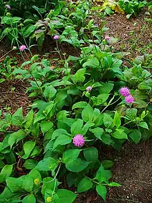 Knautia drymeia is known as a very morphologically variable species.[7] The species' subspecies can be recognized by their vegetative parts, especially their leaves' characteristics. In subspecies drymeia stem leaves are ovate to ovate-lanceolate in shape, while basal leaves have whiteish bristles. On the other hand, subspecies intermedia can be determined by yellowish bristles of basal leaves, while its stem leaves are either oblong either lanceolate. Subspecies tergestina has similarly coloured bristles of basal leaves as ssp. drymeia (white to gray), but its stem leaves are round to widely ovate and deeply serrated.[3]