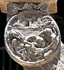 Rabbi Hanina ben Teradyon was a scholar in the second century CE, one of the ten martyrs and a particularly tragic character: His son went astray, his wife was killed by the Romans, his daughter was degraded and he was burned at the stake by Roman soldiers after being charged of studying Torah, which was against the Roman law. In the Menorah relief, Rabbi Hanina ben Teradyon is depicted on his knees tied to a pole, wrapped in a Torah scroll across his chest and in the background. Flames are seen surrounding Rabbi Hanina, and letters are floating before him - the letter "Alef" and "Shin" that together form the word "Esh" - fire, as is described in the Babylonian Talmud: "...On their return, they found R. Hanina b. Teradion sitting and occupying himself with the Torah, publicly gathering assemblies, and keeping a scroll of the Law in his bosom. Straightaway they took hold of him, wrapt him in the Scroll of the Law, placed bundles of branches round him and set them on fire. They then brought tufts of wool, which they had soaked in water, and placed them over his heart, so that he should not expire quickly... His disciples called out, 'Rabbi, what seest thou?' He answered them, 'The parchments are being burnt but the letters are soaring on high." (Babylonian Talmud: Tractate ‘Abodah Zarah Folio 18a)
