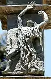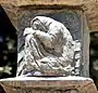 The relief opposite Rabbi Hanina is of Job, the ultimate tragic figure, a man which all happiness is denied from, only because of a "bet" between God and the Devil on whether Job would continue to believe in God and to love Him despite his personal destruction. In the relief, Job is portrayed as a broken man, lying on the ground and supporting his drooping head with his hand. He is surrounded by his wife and three comrades, but, in fact, is very much alone.