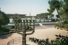 The Knesset Menorah (Hebrew: מנורת הכנסת Menorat HaKnesset) is a bronze Menorah 4.30 meters high, 3.5 meters wide, and weighs 4 tons. It is located at the edge of Wohl Rose Park (Hebrew Gan Havradim, "Rose Garden") opposite the Knesset. It was designed by Benno Elkan (1877–1960), a Jewish sculptor who escaped from his native Germany to Britain. It was presented to the Knesset as a gift from the Parliament of the United Kingdom on April 15, 1956 in honour of the eighth anniversary of Israeli independence.