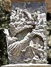 Jeremiah, also known as the "prophet of destruction" lived in Jerusalem during its fall in the hands of Nebuchadnezzar, king of Babylon. In the relief, he is shown shouting and grieving for the ruined city, and the wickedness of his people. His arms are outstretched above, one clenched in a fist, in the background are the shattered towers of Jerusalem.