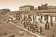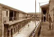 The cornerstone for the first development, Knesset Aleph, was laid in September 1892, with construction extending over the next 10 years.[10] By 1897, only 15 apartments were completed and occupied.[11] The complex was completed in 1902 with 31 apartments built in one-story row houses on three sides of a rectangular courtyard; the eastern side was left open.[10] The buildings were placed close together to maximize available land.[10] Each apartment consisted of two rooms and a kitchen.[12][13] Construction funds were provided by donations from Jews in America and Australia,[2][7] and donors' names were inscribed on marble plaques over the doorways of the apartments.[2]